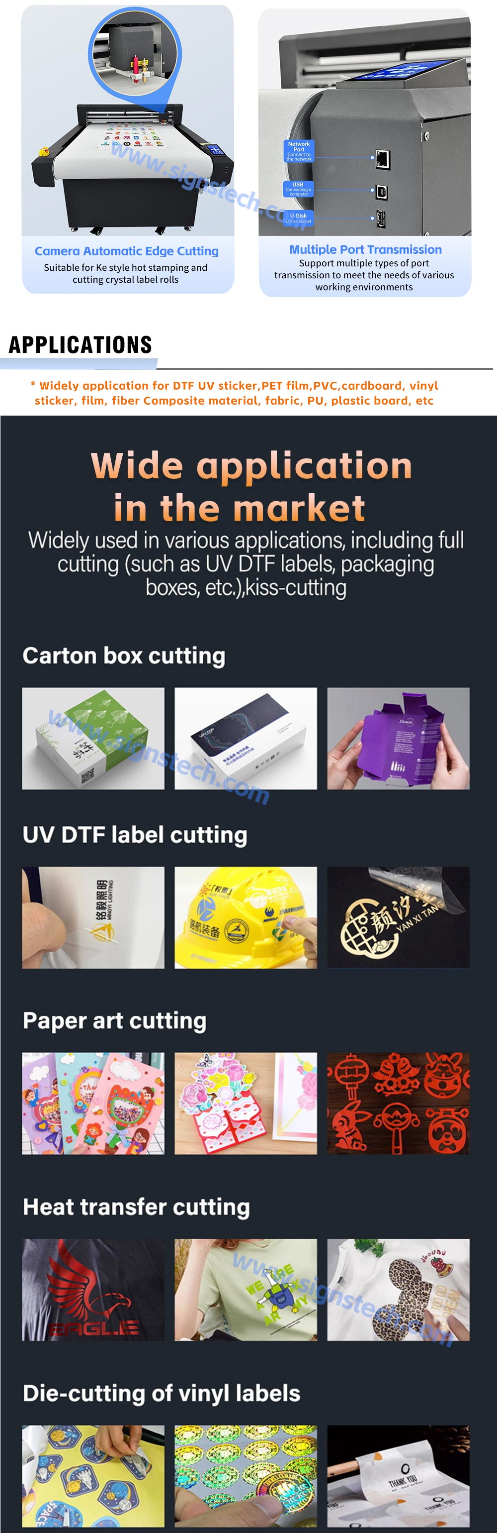 PET, PVC, cardboard, vinyl, film, fiber composite materials, Paper, PU, rubber etc. |